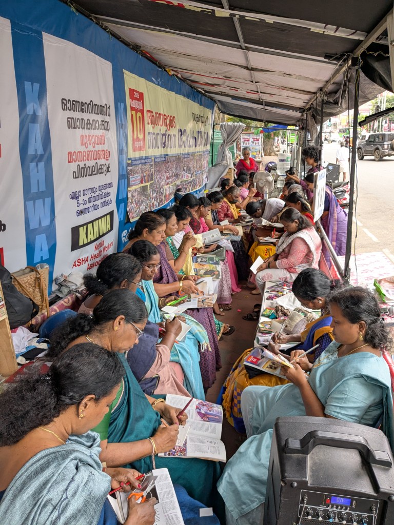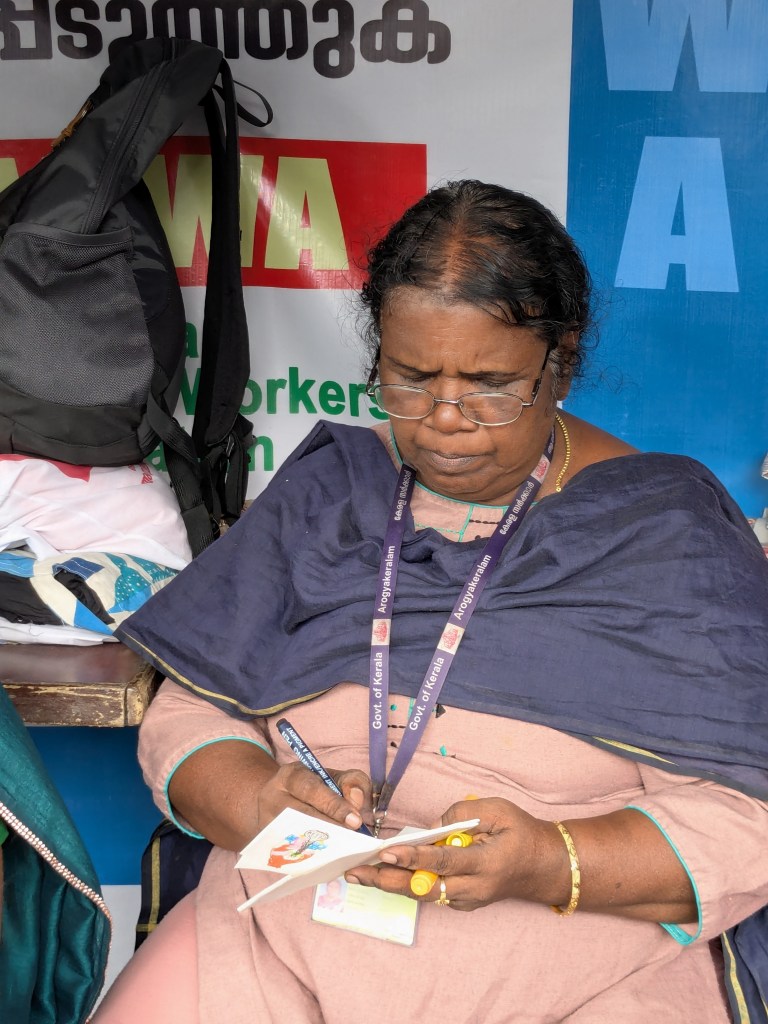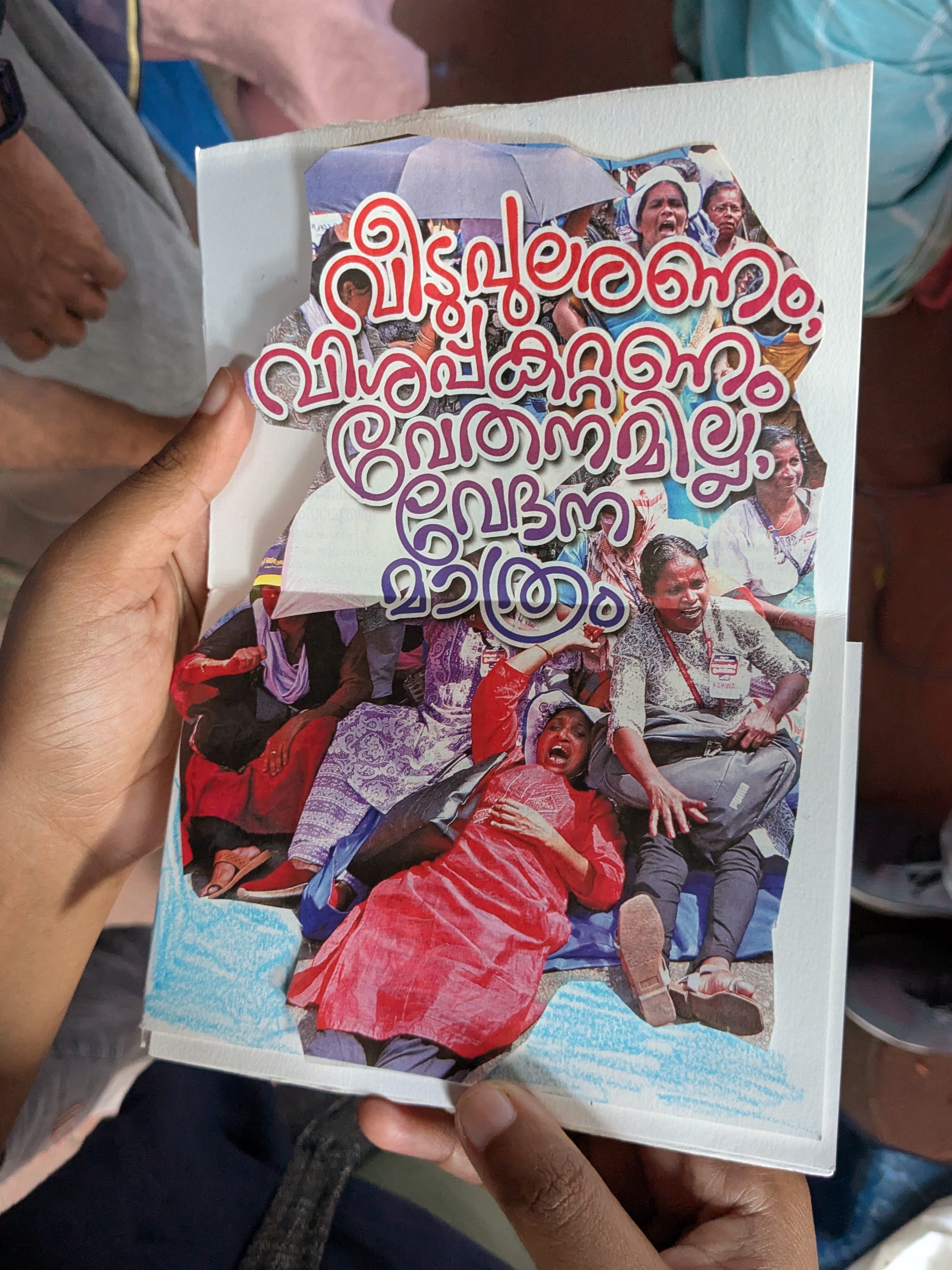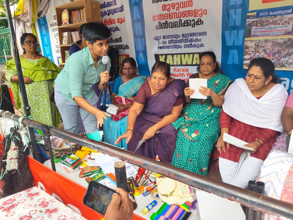 On 8th August 2025, we worked with Accredited Social Health Activists (ASHA) workers of Kerala who are protesting for fair wages, incentives, retirement benefits, and for their work to be acknowledged. I collaborated with social activist and photojournalist Harsh to organize a zine workshop where the women documented their own experiences of life; the ups and downs of working in the health sector, the joy, strength, and struggles of being a woman and part of a larger movement, the pressure of managing both home and work – especially during protests or long workdays – and how women are often expected to handle everything, etc. It was a space to tell the stories that matter to them. Twenty-seven Asha workers participated in this program, expressing themselves freely through drawing, embroidery, cut-up texts, and collages on the zine pages.
