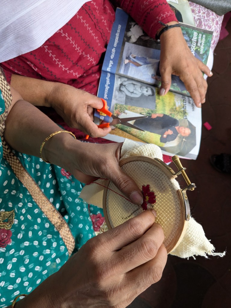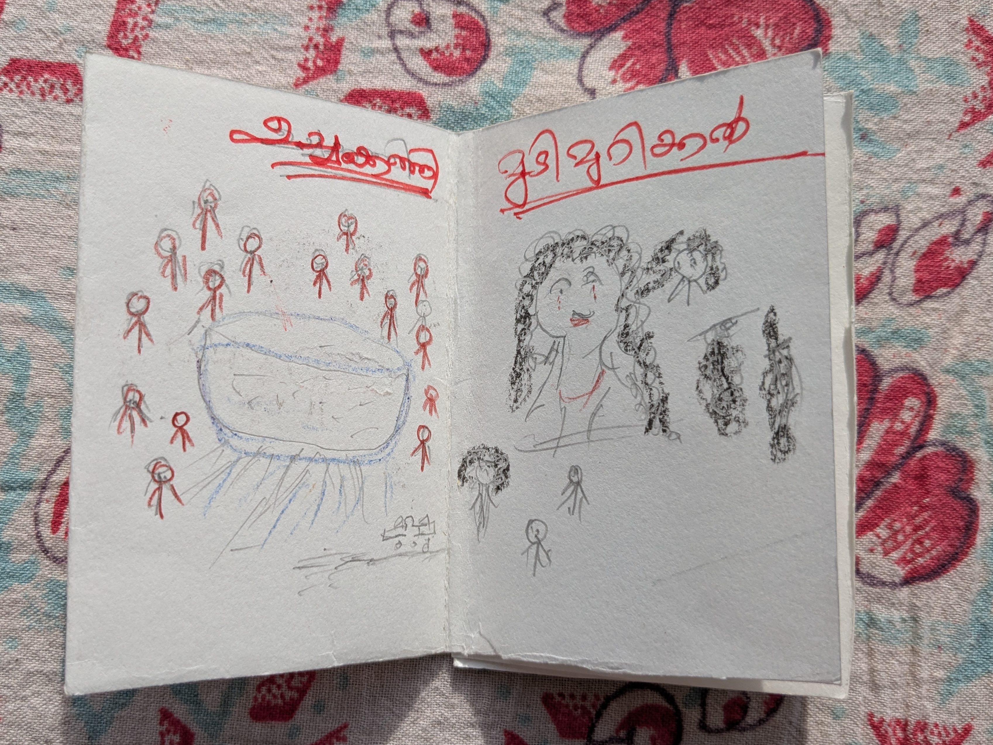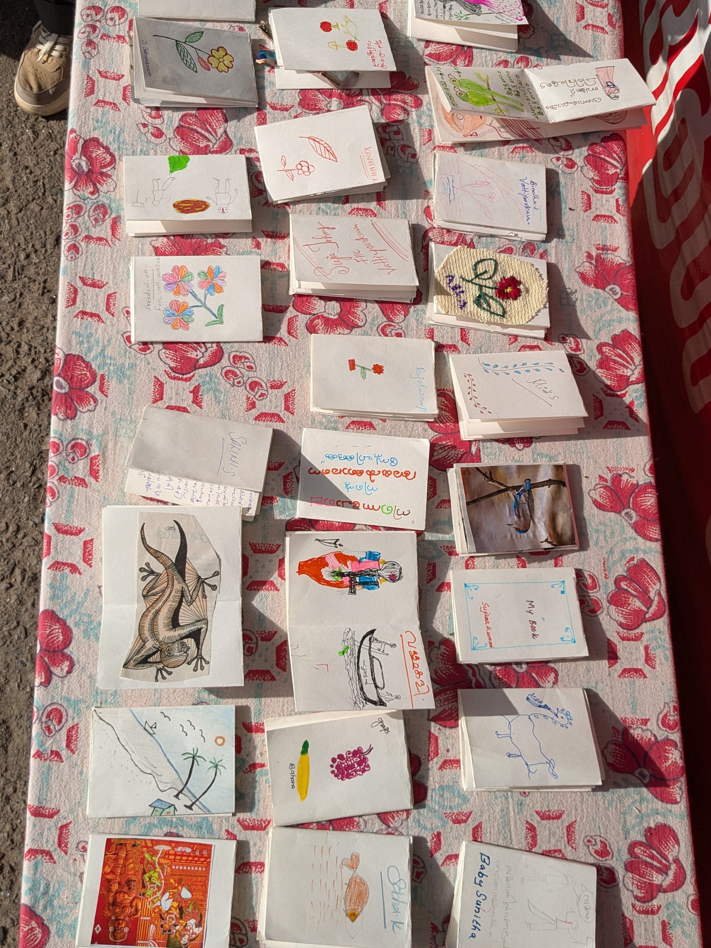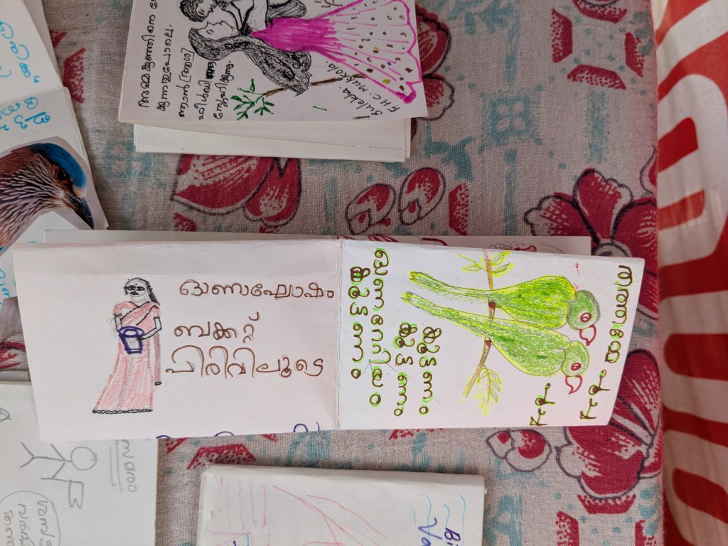 On 8th August 2025, we worked with Accredited Social Health Activists (ASHA) workers of Kerala who are protesting for fair wages, incentives, retirement benefits, and for their work to be acknowledged. I collaborated with social activist and photojournalist Harsh to organize a zine workshop where the women documented their own experiences of life; the ups and downs of working in the health sector, the joy, strength, and struggles of being a woman and part of a larger movement, the pressure of managing both home and work – especially during protests or long workdays – and how women are often expected to handle everything, etc. It was a space to tell the stories that matter to them. Twenty-seven Asha workers participated in this program, expressing themselves freely through drawing, embroidery, cut-up texts, and collages on the zine pages.